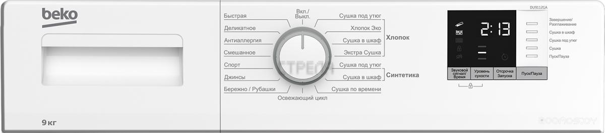 Программы: Джинсы, сушка по времени, Шерсть, Хлопок В шкаф, Хлопок Эко, Outdoor, Синтетика, Хлопок Экстра, Освежить, Рубашки, Детские вещи, Хлопок Под утюг, Хлопок, Супер 40 мин, Смешанные ткани, Спортивные вещи и обувь