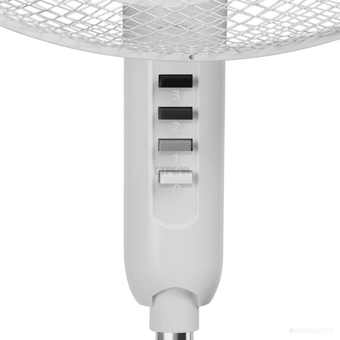 Модель оснащена механическим управлением, регулируемой высотой (от 80 до 120 см) и устойчивым крестовидным основанием, что делает её удобной и безопасной в использовании. Белый корпус из металла и пластика гармонично вписывается в любой интерьер, а компактные габариты позволяют легко перемещать вентилятор между комнатами.