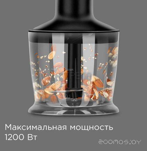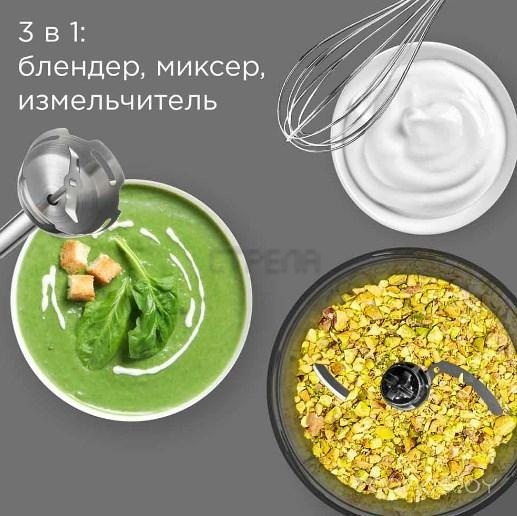Комплектация: документация, насадка-венчик, насадка-измельчитель, S-образный нож, насадка-блендер, мерный стакан, чаша для измельчения