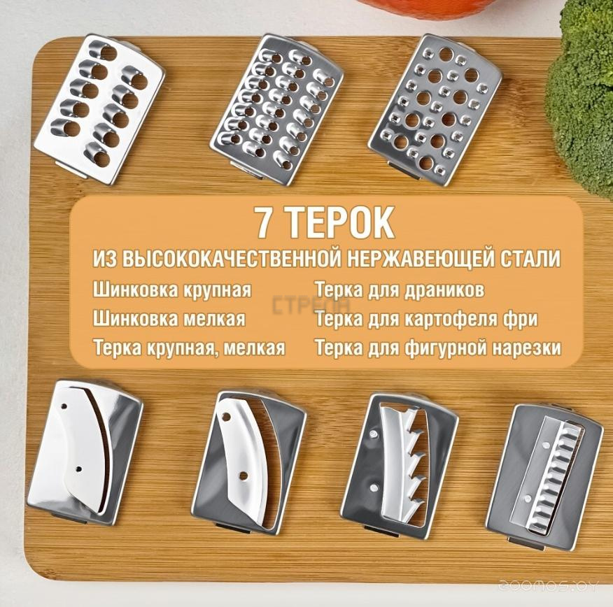 - 7 терок из высококачественной нержавеющей стали для различных видов нарезки и шинковки