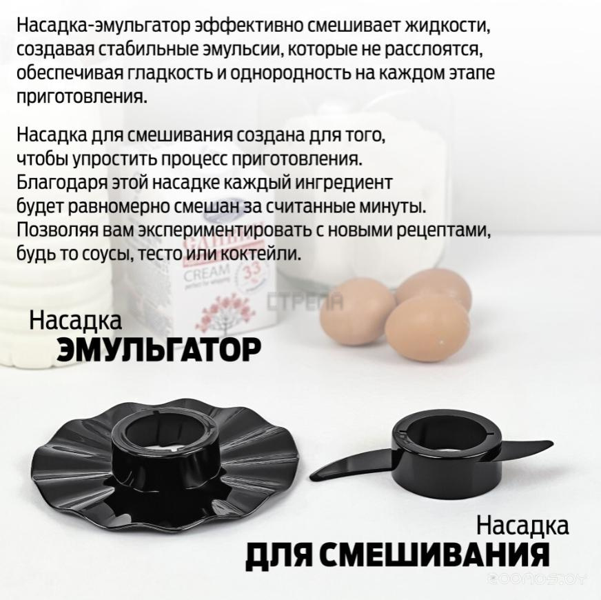 - Блендер, кофемолка, насадка для смешивания, нож измельчитель, насадка эмульгатор, насадка венчик, насадка соковыжималка для цитрусовых