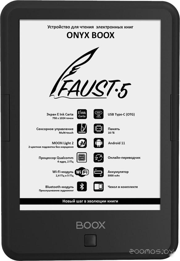 Наличие Wi-Fi обеспечивает возможность скачивать книги непосредственно с устройства и использовать другие сетевые сервисы, а поддержка Bluetooth — подключать различные беспроводные устройства, включая наушники и колонки. Использование операционной системы Android 11 дает возможность устанавливать на ридер различные сторонние приложения. Входящий в состав ПО ридера аудиоплеер дает возможность прослушивать музыку и аудиокниги, а поддержка функции TTS (Текст-в-речь) - озвучивать текстовые файлы. ONYX BOOX Faust 5 комплектуется удобной защитной обложкой.