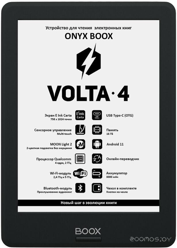 ONYX BOOX Volta 4 — шестидюймовый ридер, выполненный в компактном легком корпусе и имеющий экран E Ink Carta. Модель оборудована подсветкой с регулировкой цветовой температуры и сенсорным управлением. Современный высокопроизводительный процессор в сочетании с 2 ГБ оперативной и 16 ГБ встроенной памяти обеспечивает комфортную скорость работы во всех стандартных режимах. Наличие Wi-Fi обеспечивает возможность скачивать книги непосредственно с устройства и использовать другие сетевые сервисы, а поддержка Bluetooth — подключать различные беспроводные устройства, включая наушники и колонки. Использование операционной системы Android 11 дает возможность устанавливать на ридер различные сторонние приложения. Входящий в состав ПО ридера аудиоплеер дает возможность прослушивать музыку и аудиокниги, а поддержка функции TTS (Текст-в-речь) - озвучивать текстовые файлы. ONYX BOOX Volta 4 комплектуется защитной обложкой с удобными кнопками листания на боковой стороне.