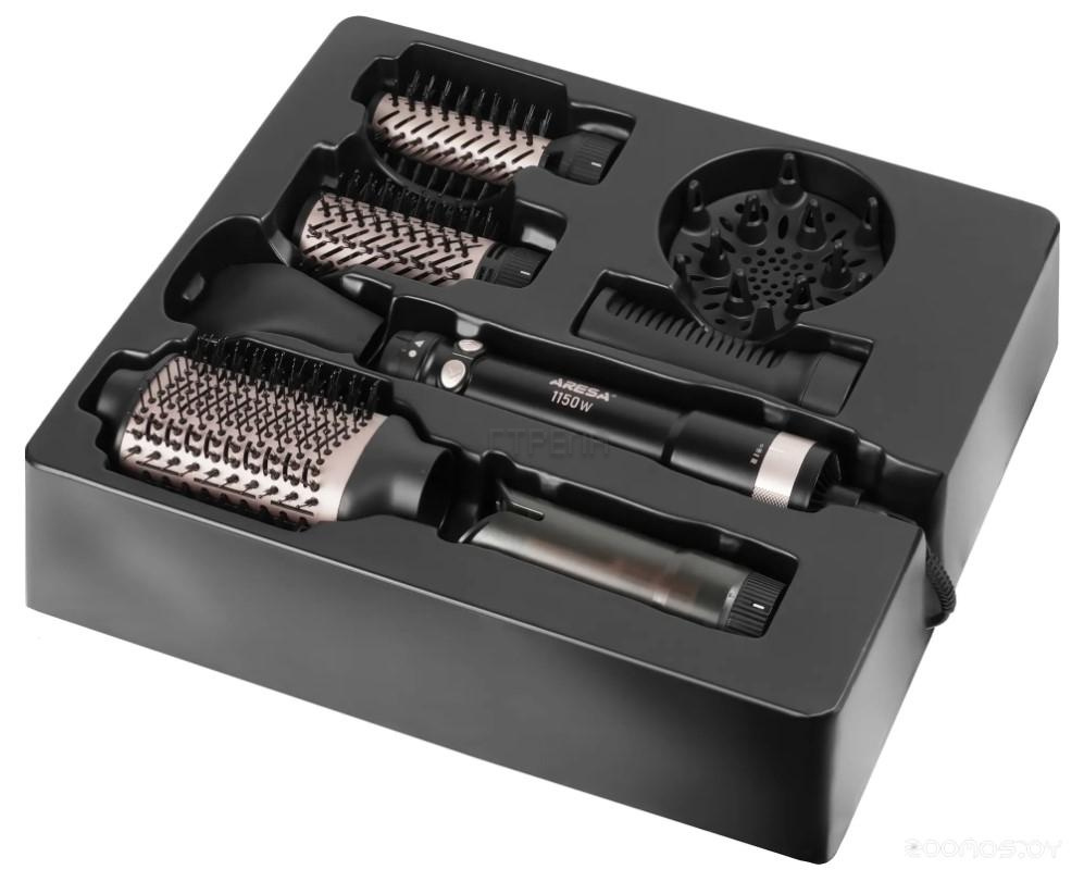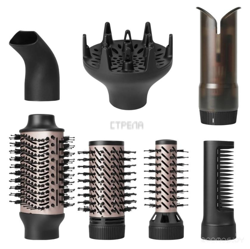 Описание набора: концентратор, щетка, диффузор, круглая насадка с мягкой щетиной, большая круглая щетка, овальная щетка, для укладки, ремешок для хранения