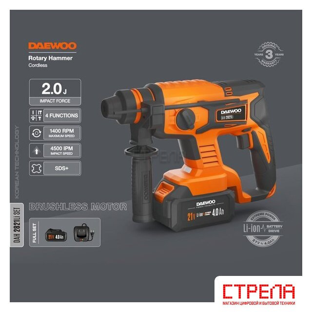 - Перфоратор - 1 шт.- Аккумулятор 4,0 Ач - 1 шт.- Зарядное устройство - 1 шт.- Дополнителная рукоятка - 1 шт.- Буры 6, 8, 10 мм. - 3 шт.- Долото острое - 1 шт.- Долото плоское - 1 шт.- Инструкция- Кейс |