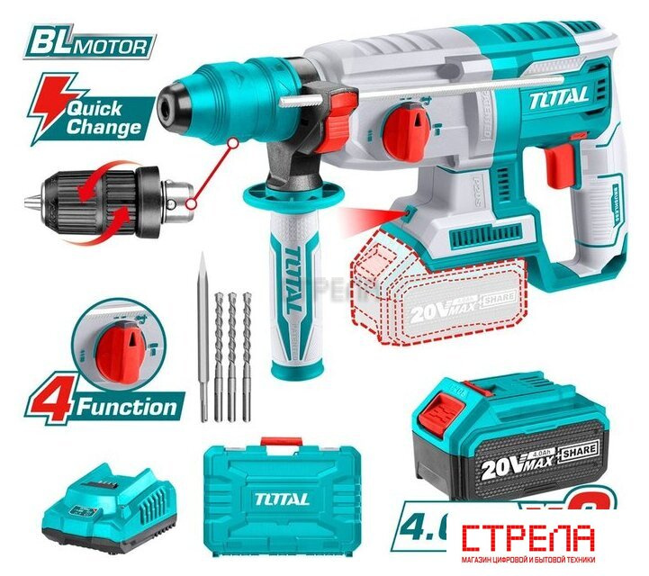 Перфоратор - 1 шт.Съемный сверлильный патрон - 1 шт.Дополнителная рукоятка - 1 шт.Ограничитель глубины - 1 шт.Аккумулятор TFBLI2002 4,0 Ач - 2 шт.Быстрое интеллектуальное зарядное устройство TFCLI2001E - 1 шт.Буры 6x150, 8x150,10x150 мм. - 3 шт.Долото - 1 шт.Кейс |