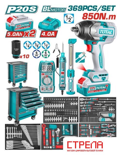 Аккумуляторный инструмент и электроникаАккумуляторный ударный гайковёрт 20 В, 1/2 — 1 шт.Аккумулятор Li-ion 5.0 Ач — 2 шт.Зарядное устройство 4 A — 1 шт.Ударные удлинённые головки 1/2 (10, 12, 13, 14, 15, 17, 19, 21, 22, 24 мм) — 10 шт.Аккумуляторный рабочий фонарь — 1 шт.Автомобильный тестер — 1 шт.Цифровой мультиметр — 1 шт.Инструментальная тележкаМеталлическая тележка с 7 ящиками — 1 шт.Колёса 5 — 2 шт.Металлические крючки для навесного инструмента — 5 шт.Инструмент 1/4Трещотка 1/4Головки 1/4Удлинённые головки 1/4TORX-головки 1/4Удлинители 1/4Гибкий удлинитель 1/4Кардан 1/4Вороток T-образный 1/4Переходник 1/4Магнитный держатель битДержатель бит 1/4Бит-головки 1/4Биты 6.35×25 ммИнструмент 3/8Трещотка 3/8Головки 3/8Удлинённые головки 3/8TORX-головки 3/8Удлинители 3/8Кардан 3/8Переходник 3/8Бит-головки 3/8Инструмент 1/2Трещотка 1/2Головки 1/2Удлинённые головки 1/2TORX-головки 1/2Свечные головки 1/2Кардан 1/2Удлинители 1/2Вороток T-образный 1/2Вороток L-образный 1/2Бит-головки 1/2Держатель бит 1/2Переходник 1/2БитыБиты 8×30 ммБиты 8×70 ммКлючиКомбинированные ключиКлючи для тормозных трубокОтогнутые накидные ключиШестигранные ключиTORX-ключиРазводной ключ 10Ключ с фиксатором (lock wrench)Ключ масляного фильтраКлещи для масляного фильтраОтвёрткиСтандартные отвёрткиУсиленные отвёртки (go-thru)Плоскогубцы и зажимыПассатижи комбинированныеДлинногубцыБокорезыКлещи переставныеКлещи для стопорных колецУдарный и слесарный инструментМолоток без отдачи 2 lbМолоток шаровый 16 ozСъёмники обшивки — 5 шт.Экстракторы — 5 шт.Магнитный телескопический захватЗубила — 3 шт.Выколотки — 6 шт.Керны — 3 шт. |