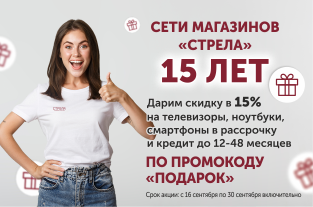 В этом году магазины СТРЕЛА отмечают свой 15-летний юбилей! В честь этого знаменательного события мы подготовили для вас особенные подарки. Скидка 15% на телевизоры, ноутбуки и смартфоны по промокоду - ПОДАРОК. А чтобы сделать покупку еще более удобной, мы предлагаем рассрочку и кредит на срок от 12 до 48 месяцев.
