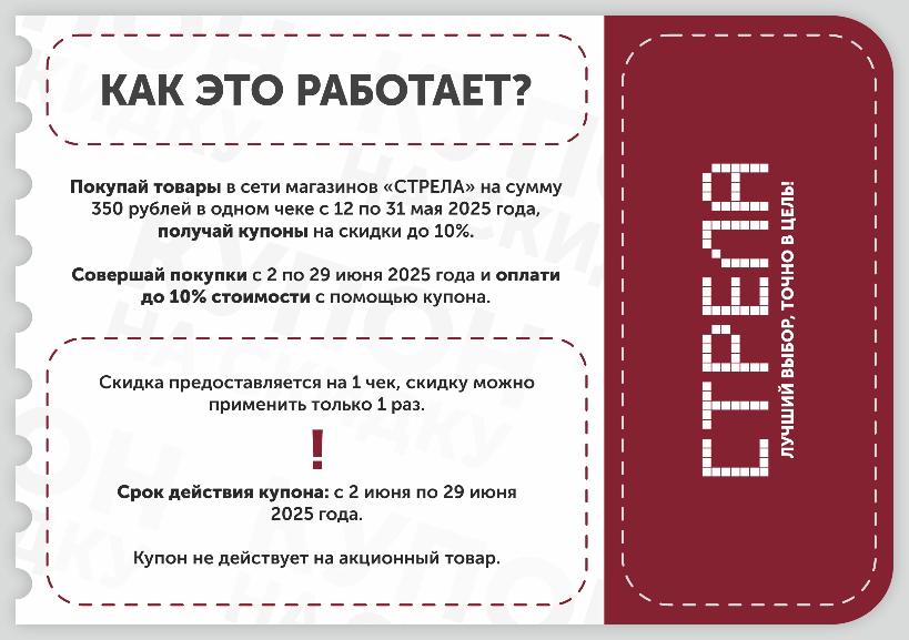 С 12 по 31 мая соверши покупку в сети магазинов СТРЕЛА на сумму от 350 р в одном чеке и получи купон на скидку до 10%! скидка будет в виде суммы в деньгах от первой покупки.